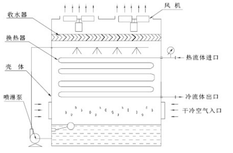 工作時,載熱介質(zhì)(冷卻水、油或其他液體)由系統(tǒng)循環(huán)泵驅(qū)動,在換熱器盤管內(nèi)及需冷卻設(shè)備(如∶電源、爐體等)之間循環(huán)流動,載熱介質(zhì)熱量向盤管管壁傳導。噴淋水均勻地噴灑在換熱器上,在換熱器盤管外表面形成均勻的水膜。在風機的作用下,冷空氣由塔體下方的進風口進入塔內(nèi),與噴淋水逆流經(jīng)過換熱器表面,充分接觸,并進行潛熱和顯熱交換,部分水蒸發(fā),使噴淋水溫降低,吸收熱量后的飽和濕熱空氣由風機排至大氣中,低溫噴淋水吸收盤管熱量后流入塔體下部水槽,再由噴淋泵再輸送至噴淋系統(tǒng)。如此往復(fù),換熱器內(nèi)的載熱介質(zhì)得到降溫冷卻。在熱交換過程中,盤管內(nèi)的載熱介質(zhì)因為沒有與空氣直接接觸,使得品質(zhì)特性得以保持,不會污染、濃縮、吸濕及揮發(fā)。