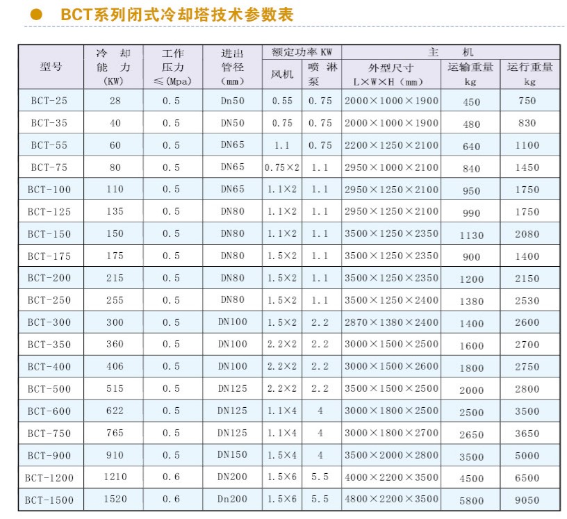 主機由殼體、換熱器、風機、噴淋系統(tǒng)、收水器、水槽及管路閥門等零部件組成。